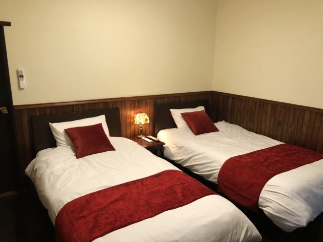 ◇洋室は2台のベッドに加え、赤いソファに木材の壁と、レトロな雰囲気のお部屋。