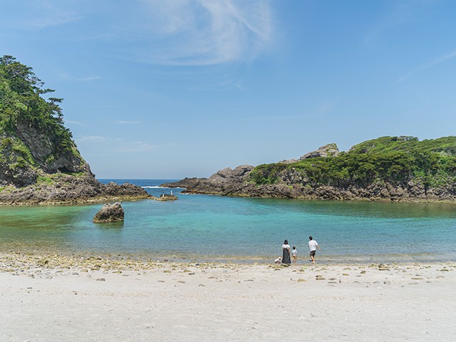岩に囲まれた入り江が特徴で、映画に出てくるようなプライベートビーチの雰囲気漂う海水浴場です。