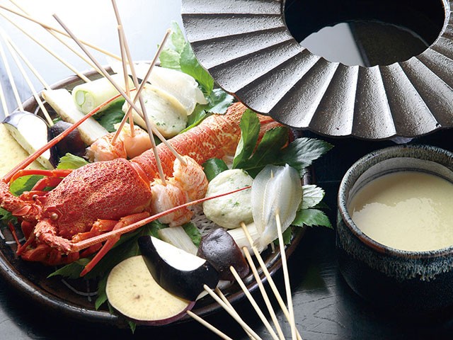伊豆大島の特産である椿油を使い、伊勢海老や明日葉などの食材を、揚げながら楽しむ「椿フォンデュ」をお召し上がりいただけます。
