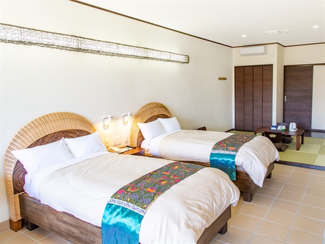 新和洋室には、シングルベッド2台に琉球畳風の和のスペースがございます。