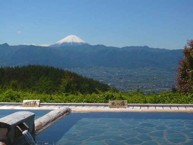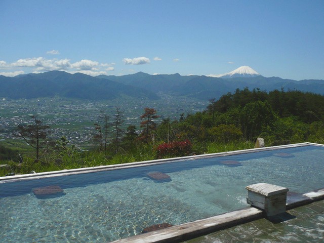 開放的な露天風呂の眼下には甲府盆地が広がり、天気がよければ富士山も望める絶景の温泉♪