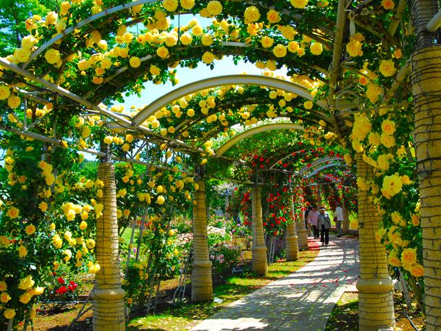 山梨県にあるアルプスの少女ハイジをイメージした花と幸せのテーマパーク。四季折々の花々が咲き誇りハイジの住むスイスの街並みを忠実に再現しています。どこを見てもロマンティックで絵になる風景が広がります。季節の花々、レストラン、ショップ、広場やチェペル、まるでメルヘンの世界へ迷い込んだよう!園内は、1,200品種、7,000本が見ごろを迎え、関東最大級のバラ園となります。回廊をくぐれば薔薇の香水をあびているようです。